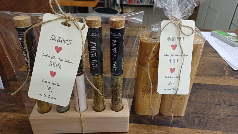Gewürze einzeln in Röhrchen, oder zusammen als fertiges Geschenk verpackt mit passendem Anhänger, so dass es direkt übergeben werden kann.